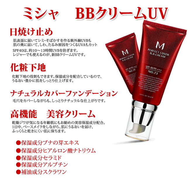 商品名 BB クリーム UV メーカー MISSHA 商品規格等 【内容量】:50g 商品詳細 ミシャはたゆまぬ研究開発を通じ、商品力の強化に努めています。